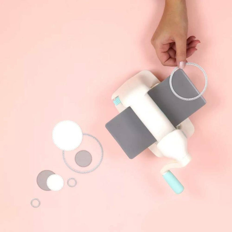 A Mini Evolution funciona como uma prensa, com um pratico manípulo giratorio que te permite passar as placas de corte e o material que estas a trabalhar pela maquina. Alem disso, o sistema de ventosa com uma alavanca garante que a maquina se fixe firmemente à base, proporcionando estabilidade enquanto trabalhas. O kit inclui uma placa protetora, uma placa de corte, uma placa de estampagem, oito furadores de papel para cortar círculos de diferentes tamanhos, duas pastas de textura, e 50 folhas de cartulina pre cortadas.