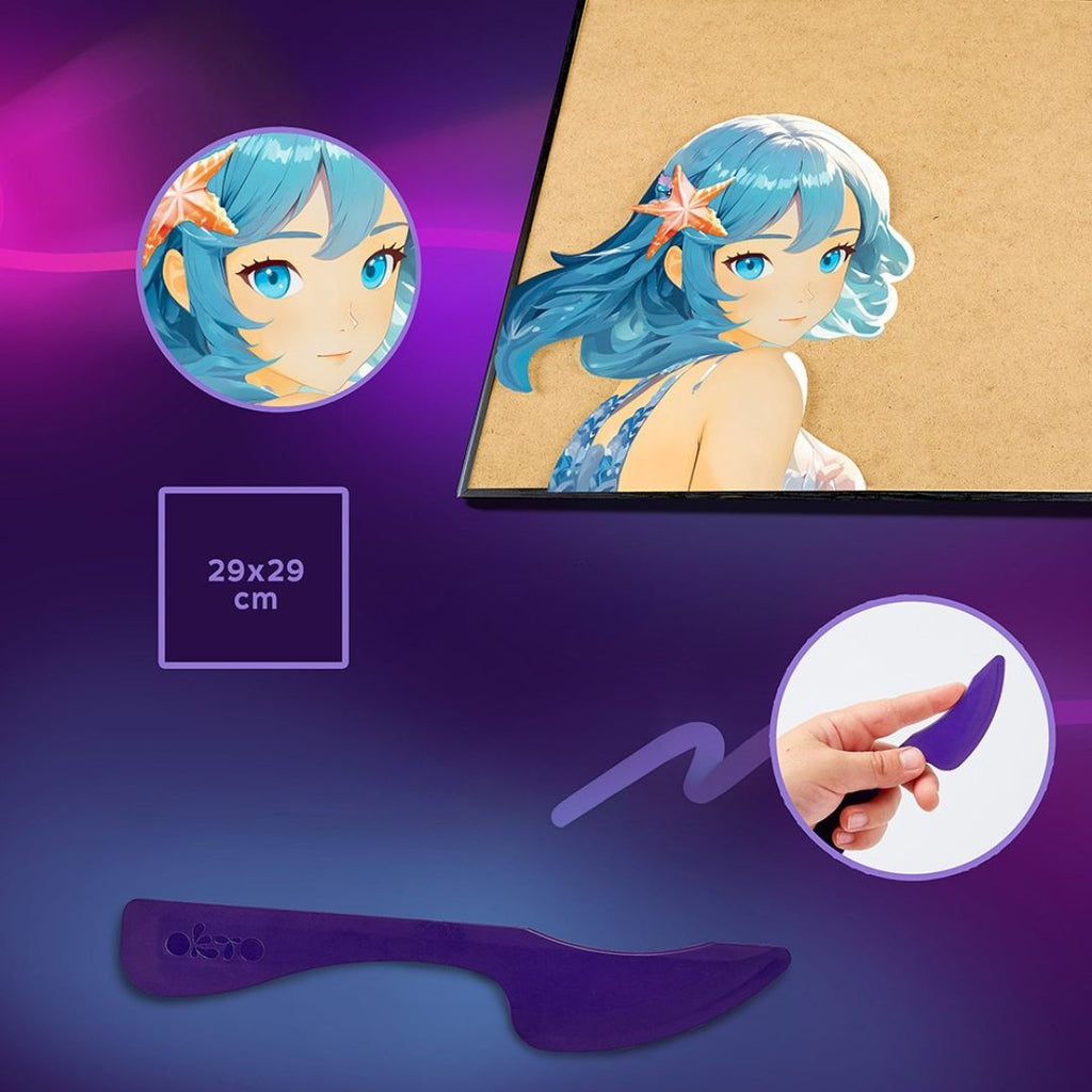 Los lienzos OKTO 3D combinan pintura y escultura para ofrecer una experiencia relajante y muy creativa. El lienzo incluye la imagen de una chica anime como personificación del elemento del agua, entonces, la arcilla se coloca al rededor de su figura para así completar el diseño final y darle forma al cuadro.