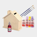 Este conjunto inclui um conjunto de 4 tintas acrílicas, um frasco de 20ml de cola com glitter, uma caixinha de madeira em forma de casa e um conjunto de 3 pinceis.