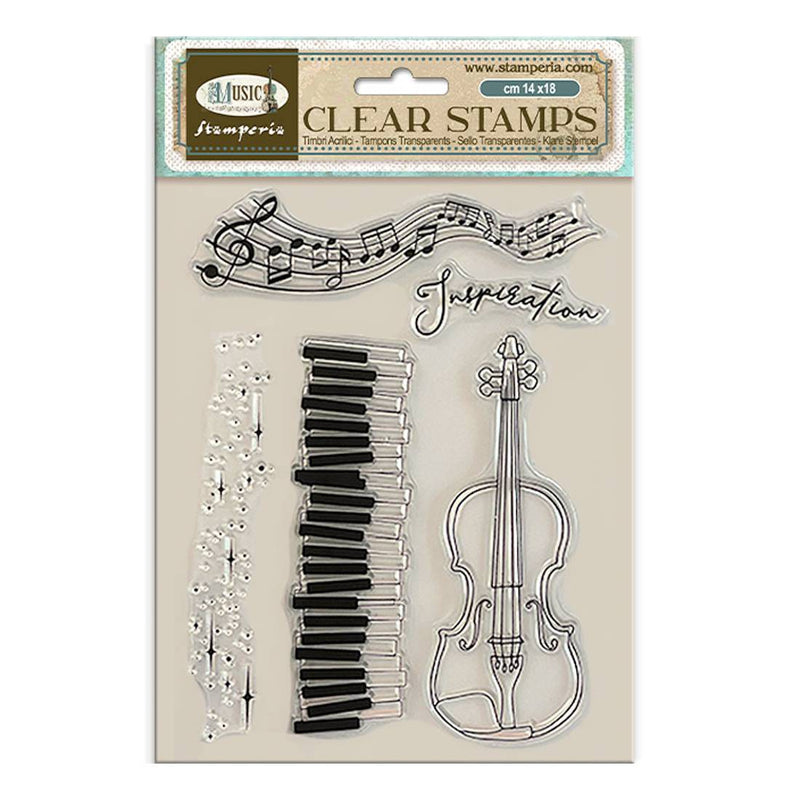 Pack de 5 carimbos de acrílico transparente em formato de violino e notas musicais 'Música' da Stamperia