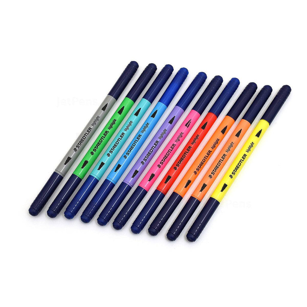 Conjunto de 10 Marcadores Fluorescentes com Ponta Dupla, biselado e pincel, da marca Staedtler