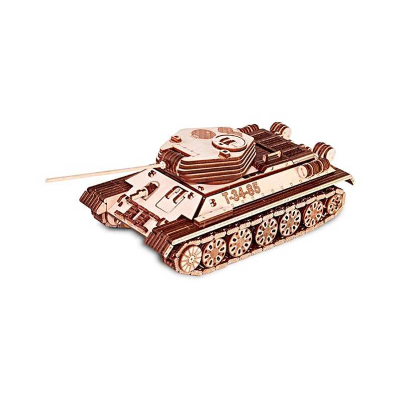 Este incrível kit de maquete de madeira do Tanque T 34 85 da marca Eco Wood Art e simplesmente espetacular! Com 965 pecas de madeira, as tuas horas de diversao estao garantidas ao montar este puzzle mecânico 3D em forma de tanque.